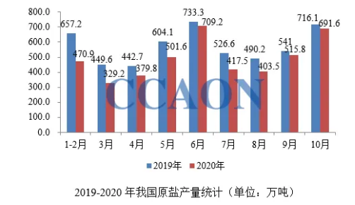 2020, China's crude salt output was 6.916 million tons, an increase of 5.1% year-on-year; from January to October, the crude salt output was 45.297 million tons, a cumulative decrease of 0.4% year-on-year. The main reasons for the increase of crude salt production in October are the expansion of salt raking area in the sea salt production area in autumn and the improvement of mineral salt enterprises.