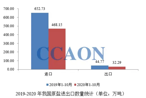 According to the latest customs data, in October 2020, China's crude salt import volume was 595600 tons, with a year-on-year increase of 6.14%; in October, the crude salt export volume was 65900 tons, a year-on-year decrease of 14.82%. From January to October, China's crude salt import volume was 4.6815 million tons, down 28.18% year-on-year; the export volume of crude salt was 322900 tons, down 27.89% year-on-year.