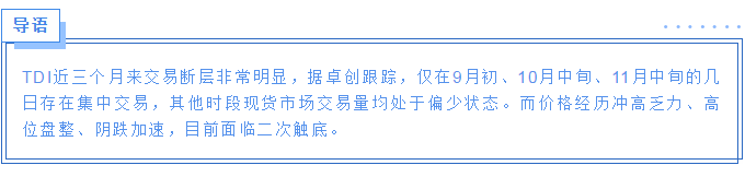 而在行情面上,月内13日的交易放量和反弹后,TDI未能持续反弹实现反转,而是再度进入阴跌失量形态,重新跌落至前期低点,月底华东国产现货价格12200-12300元/吨占据主流,基本与中旬时的低点持平。